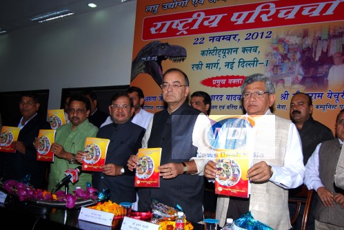 BJP leader Arun Jaitley with JDU minister Sharad Yadav & CPI(M) leader Sita Ram Yechury with traders Praveen khandelwal released a book "impact of FDI in retail on Micro small & Medium Enterprises of India".