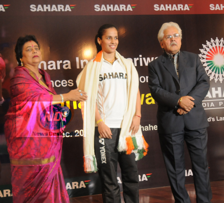 In an event at Sahara Shaher, Sahara announced its association with Saina Nehwal. Saina was named as their new Brand Ambassador. Kumkum Roy Choudhary , Executive Director Worker, Sahara India Pariwar, Badminton Sensation Saina Nehwal and Ashok Roy Choudhury, Executive Director Worker, Sahara India Pariwar were present at this occasion