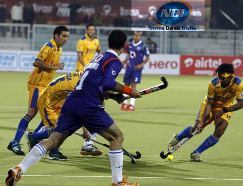 Jaypee Punjab Warriors' struck their first goal against Uttar Pradesh Wizards in a HIL match played at Surjit Singh stadium in jalandhar on 17th January 2013.