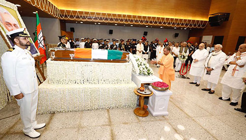 New Delhi, 17 August: UTTAR PRADESH CHIEF MINISTER YOGI laying wreath on the mortal remains of former Prime Minister Atal Bihari Vajpayee at his residence in New Delhi.